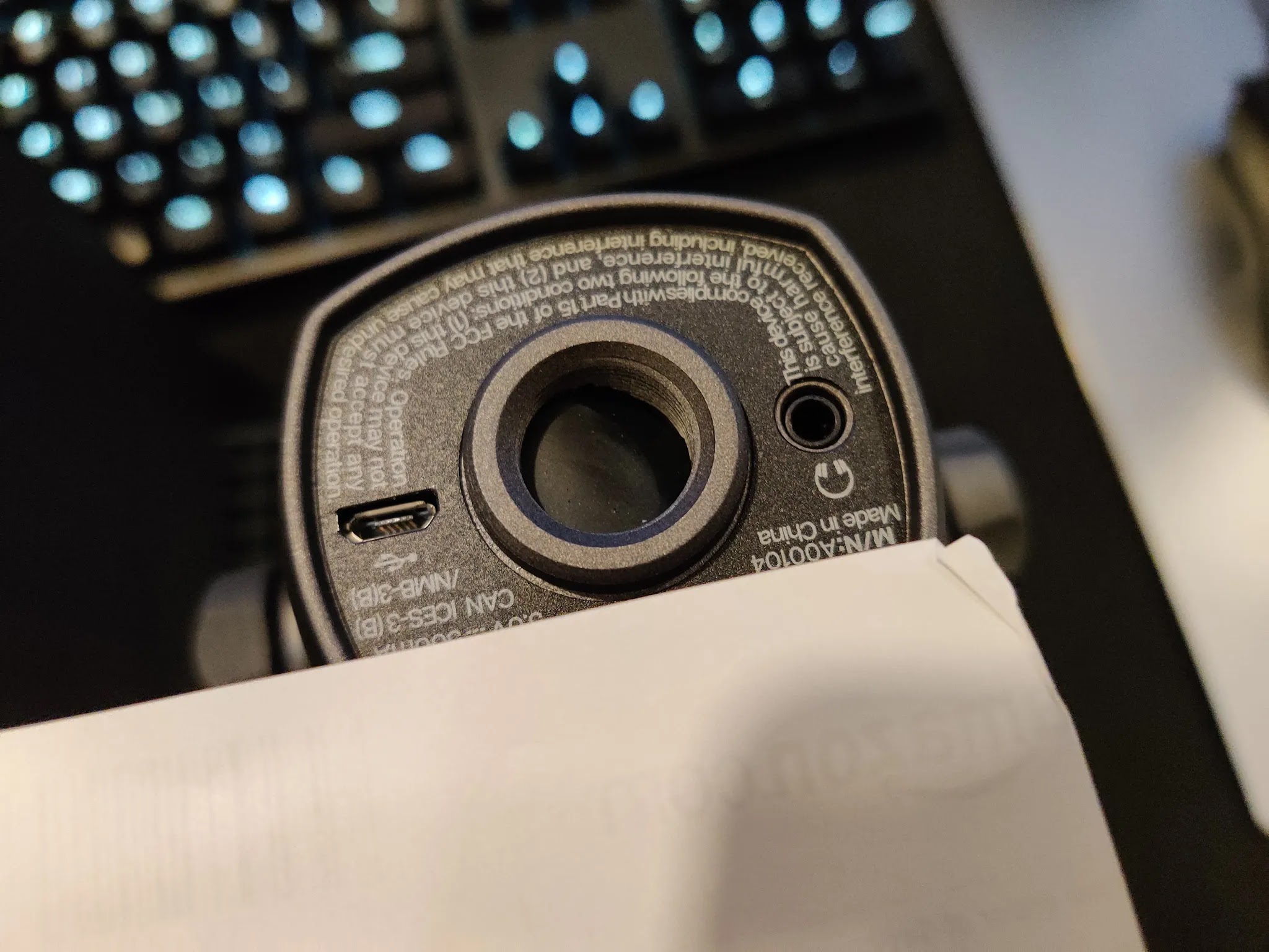背後插座部分,中間大孔是接支架的,左邊孔是 USB 接口,右邊是監聽耳機孔。